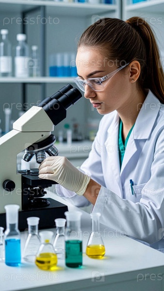 Лабораторный ассистент, работающий с микроскопом и лекарствами