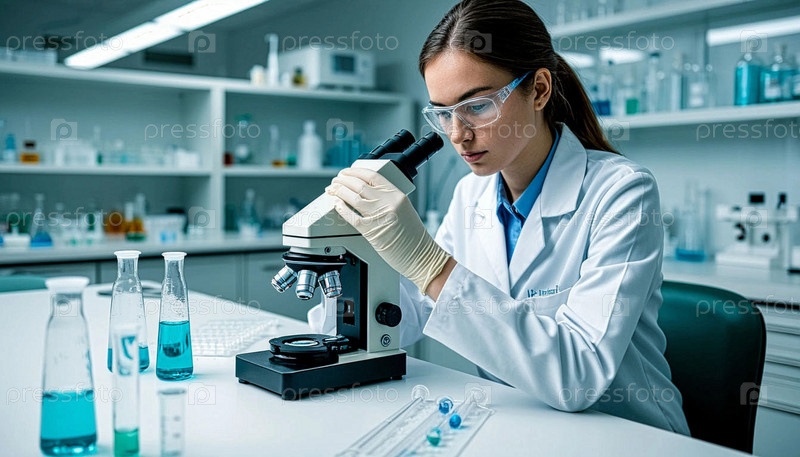 Медицинский работник девушка в лаборатории смотрит через микроскоп