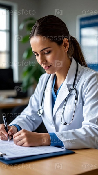 Врач в кабинете за столом заполняет документы/отчет