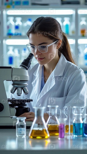 Медицинский работник за столом с микроскопом, колбами и пробирками