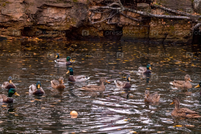 Многие утки купаются в пруду осенью