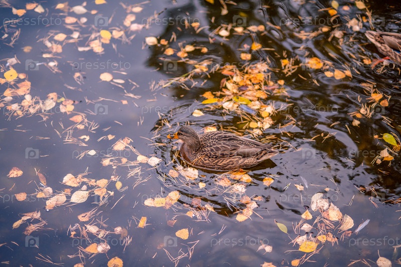 Одна утка плавает в пруду