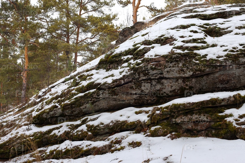 Старые камни, покрытые мхом и снегом.Природа Южного Урала