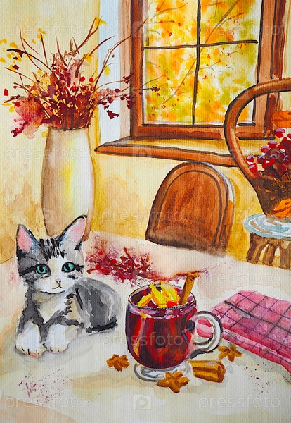 Осенний натюрморт с кошкой, акварель