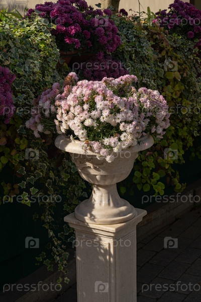 Большой каменный горшок содержит ярко-розовые и фиолетовые хризантемы на фоне пышного зеленого плюща.Эта элегантная садовая сцена излучает очарование и естественную красоту
