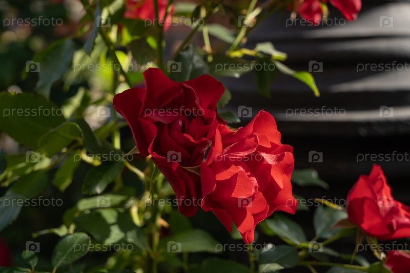 Красная роза в полном цветении окружена пышным зеленым лиственницей, захватывая красоту и элегантность природы.Мягкие лепестки создают тонкий контраст с яркими листами, олицетворяющими спокойствие