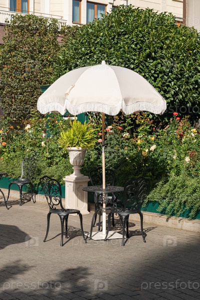 Тихая уличная сцена кафе с элегантным белым зонтиком, обеспечивающим тень над черным металлическим столом и стульями