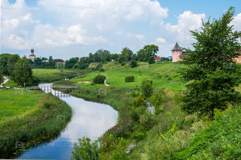 Живописный вид на окраину города в российских провинциях с видом на реку и монастырскую стену
