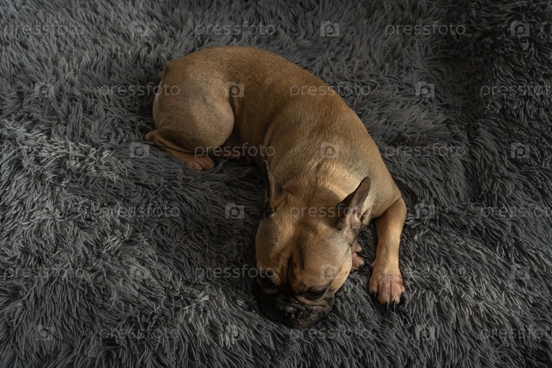 Французский бульдог тихо лежит на мягком сером текстильном одеяле, показывая спокойствие и легкость.Серенная осанка предполагает комфорт и расслабление в уютной атмосфере