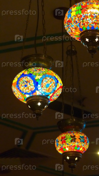 Цветные турецкие фонари висят с потолка, демонстрируя сложные мозаичные узоры.Теплое яркое свечение создает привлекательную атмосферу и подчеркивает традиционное мастерство