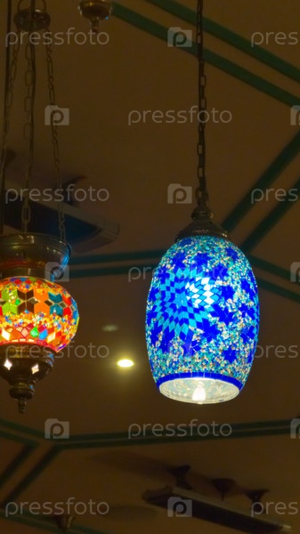 Цветные турецкие фонари висят с потолка, демонстрируя сложные мозаичные узоры.Теплое яркое свечение создает привлекательную атмосферу и подчеркивает традиционное мастерство