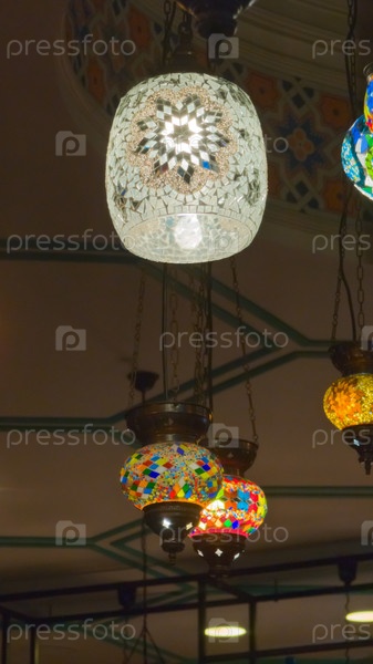Цветные турецкие фонари висят с потолка, демонстрируя сложные мозаичные узоры.Теплое яркое свечение создает привлекательную атмосферу и подчеркивает традиционное мастерство