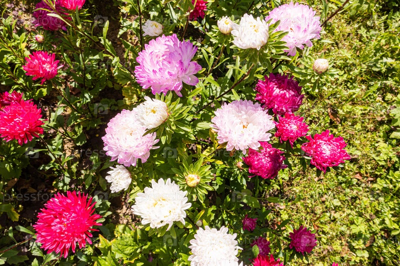 В саду цветут ярко окрашенные астеры. вид сверху. клумба осенних цветов в парке, загородный дом