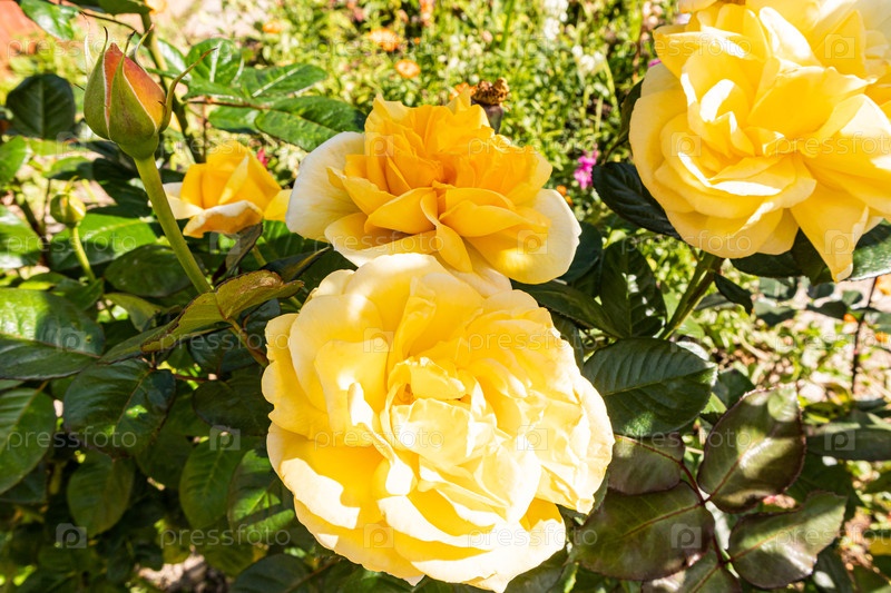 Красиво цветущая распыляемая роза с нежными желтыми цветами в солнечный летний день.Ботаническая обои.Розы в саду