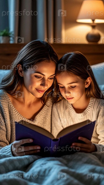 Уютная сцена: мать и ребенок читают книгу перед сном