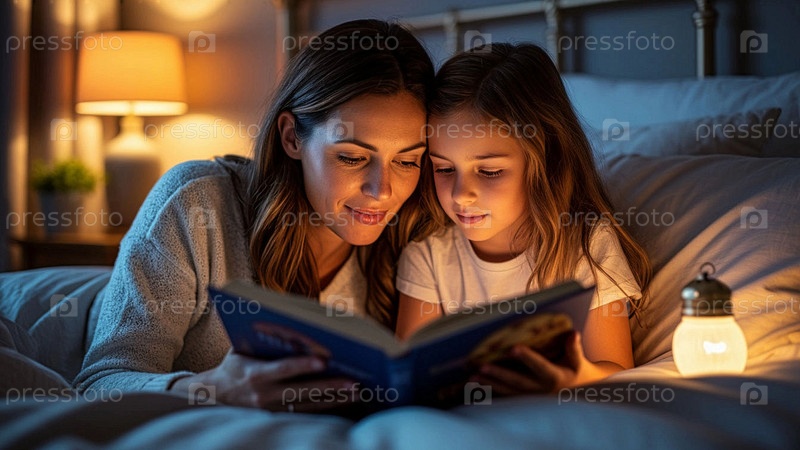Мама и дочь проводят время вместе, читая книгу перед сном в постели