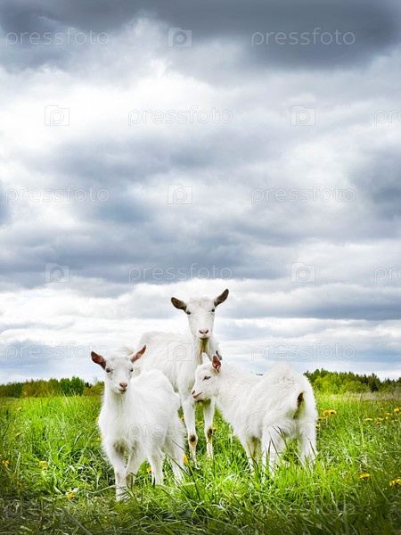 Белые козы и домашние козлы стоят вместе на пышной луге под драматическим небом