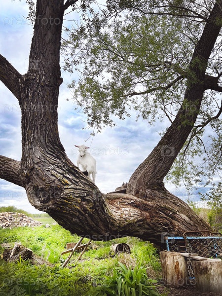 Белая коза балансирует на густой ветке дерева, в сельской местности