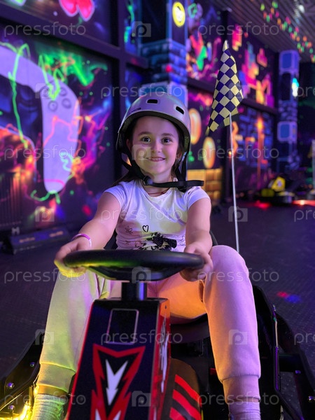 Ребёнок в шлеме и катающийся на го-карте, окруженный неоновыми огнями во время веселья