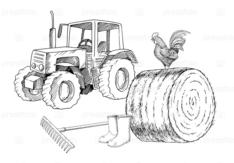 Трактор и петух на стоге сена, сапоги и грабли. Ручная иллюстрация в стиле векторного чернила. Для дизайна упаковки, карт, обложек, принтов, этикеток продуктов и тканей