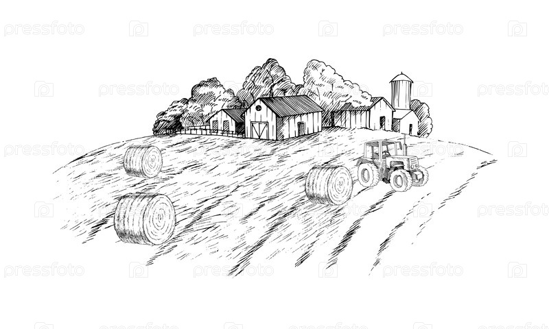 Ферма и поле с стопами сена и трактором. Ручная иллюстрация в стиле векторного чернила. Для дизайна упаковки, карт, обложки, печати, этикеток на продуктах и тканей