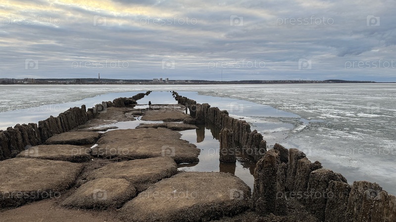 Старый разрушенный мост через зимний Ижевский пруд Удмуртии