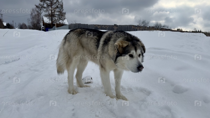 Собака хаски маламут в зимний день