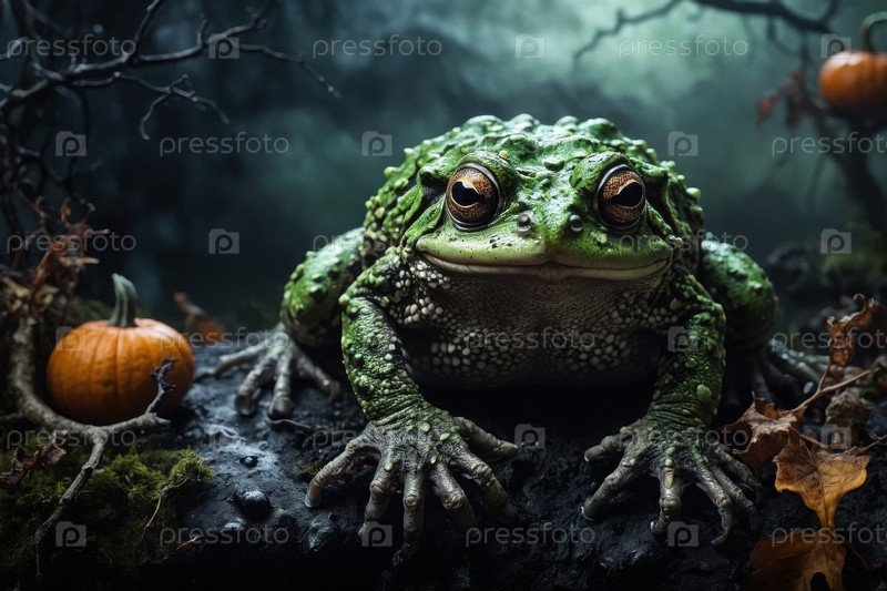 Большая зеленая лягушка жаба темный пугающий фон осень Хэллоуин праздник ИИ генератив