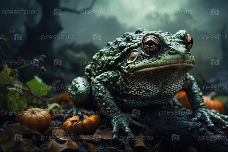 Большая зеленая лягушка жаба темный пугающий фон осень Хэллоуин праздник ИИ генератив