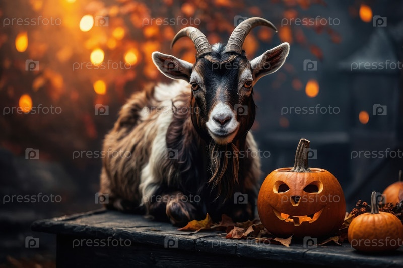 Генеративная рогатая фермерская коза на темном и пугающем фоне Хэллоуина с тыквами