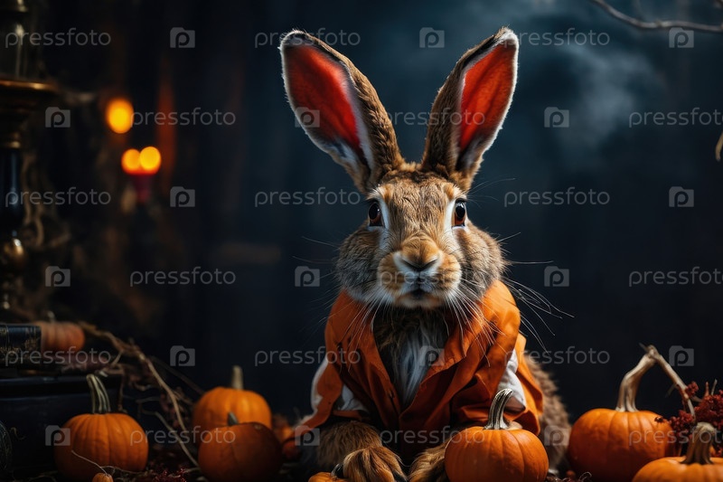 Генеративный милый пушистый кролик на темном страшном Хэллоуинском лунном свете с тыквами