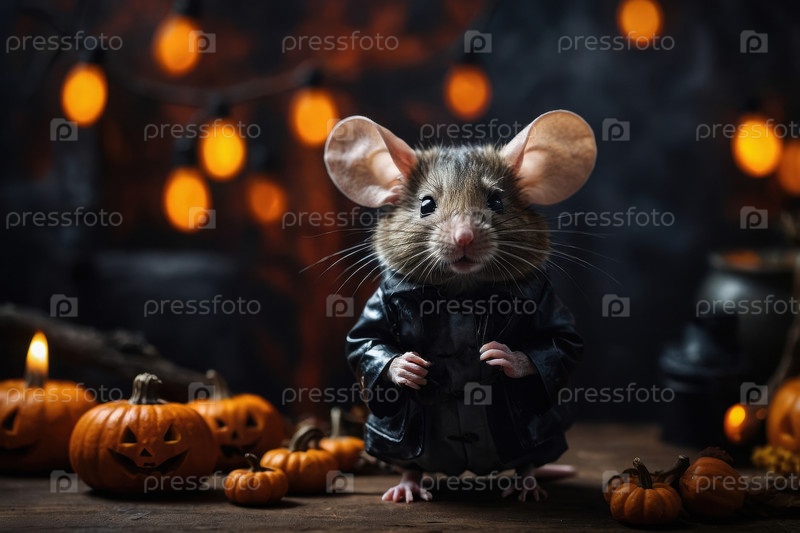 AI Generative Fluffy mouse animal on dark scary Halloween pumpkin background (Генеративная ИИ пушистая мышь-животное на темном страшном фоне тыквы Хэллоуина)