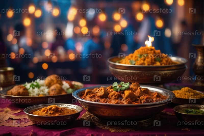 Дивали традиционные индийские блюда из карри, риса и сладостей, декоративный фон AI Generative