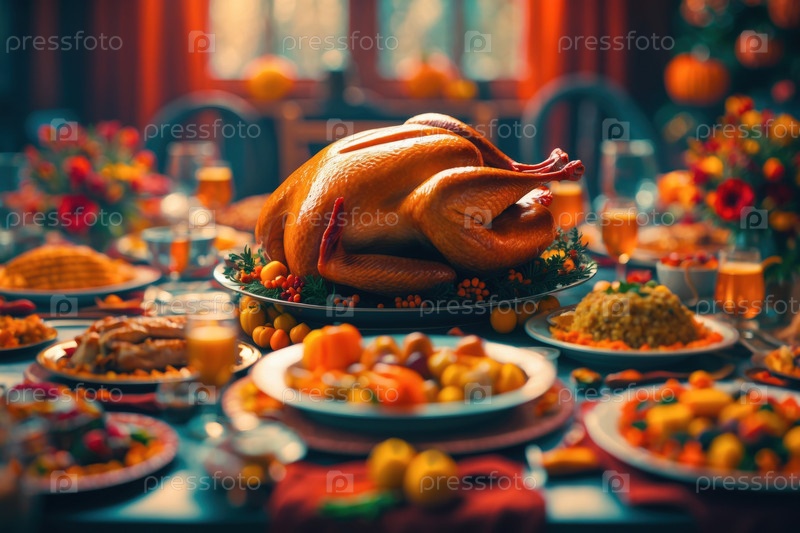 Жареный индей на украшенных столом желтых листьях и апельсиновых тыквах для ИИ Generative Thanksgiving