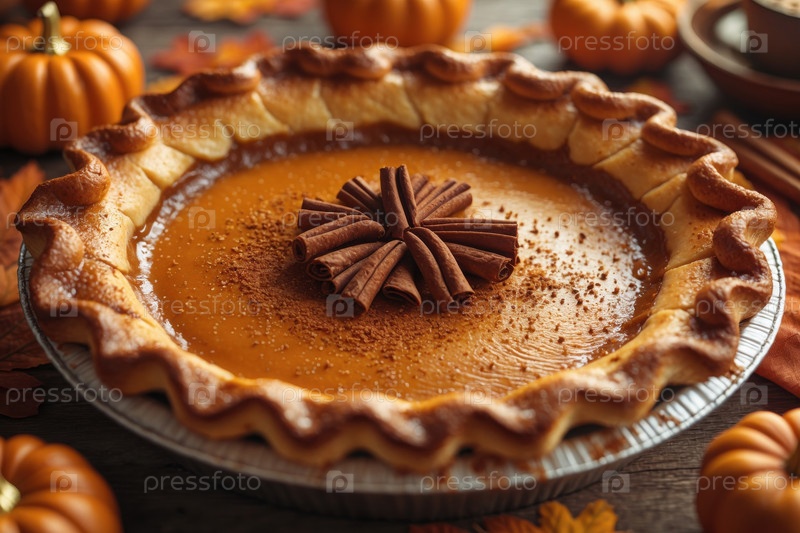 Тыквенный пирог с корицей на украшенном столе с апельсиновыми тыквами для Дня благодарения AI Generative