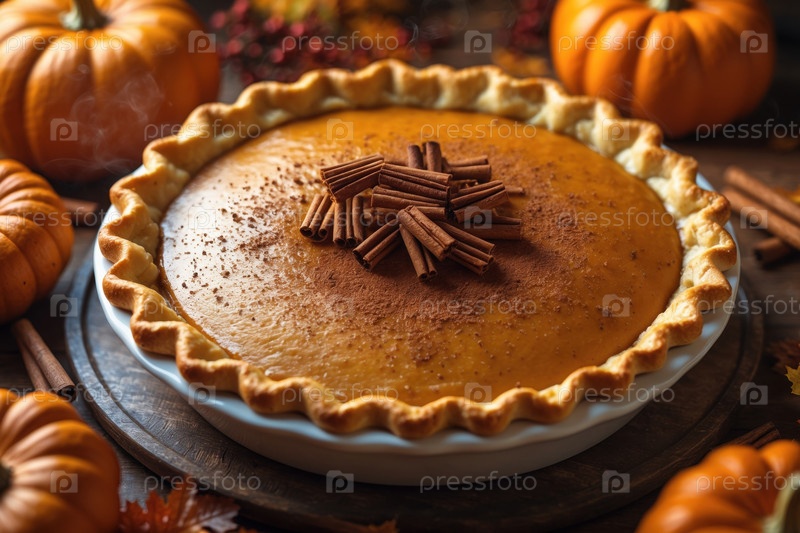 Тыквенный пирог с корицей на украшенном столе с апельсиновыми тыквами для Дня благодарения AI Generative