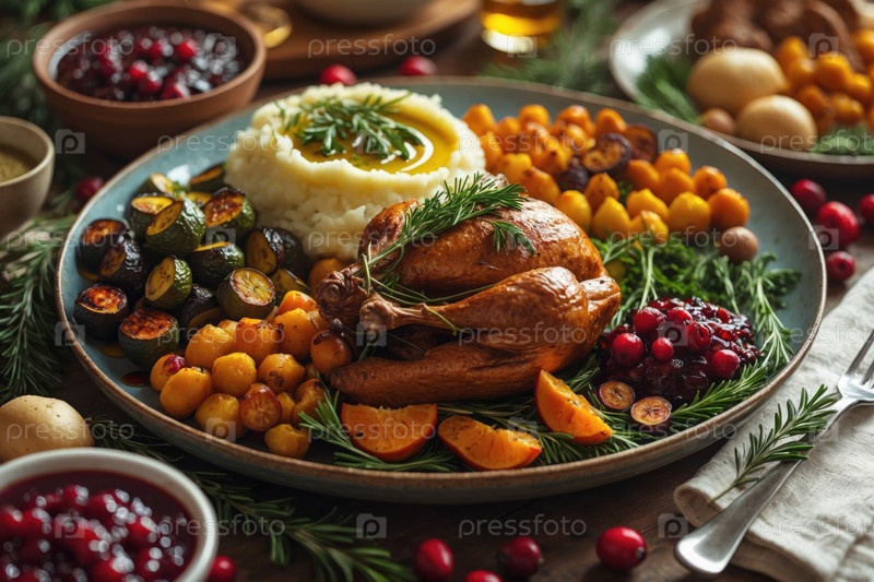 Традиционный праздничный ужин Благодарения с различными блюдами и едой на украшенном столе