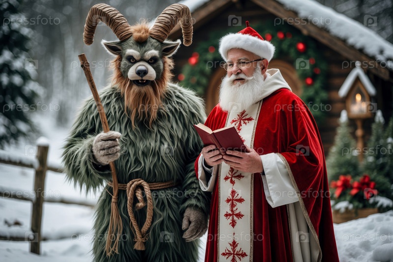 Генеративные герои Рождества Святой Николай и жуткое чудовище Крампус в день зимнего праздника