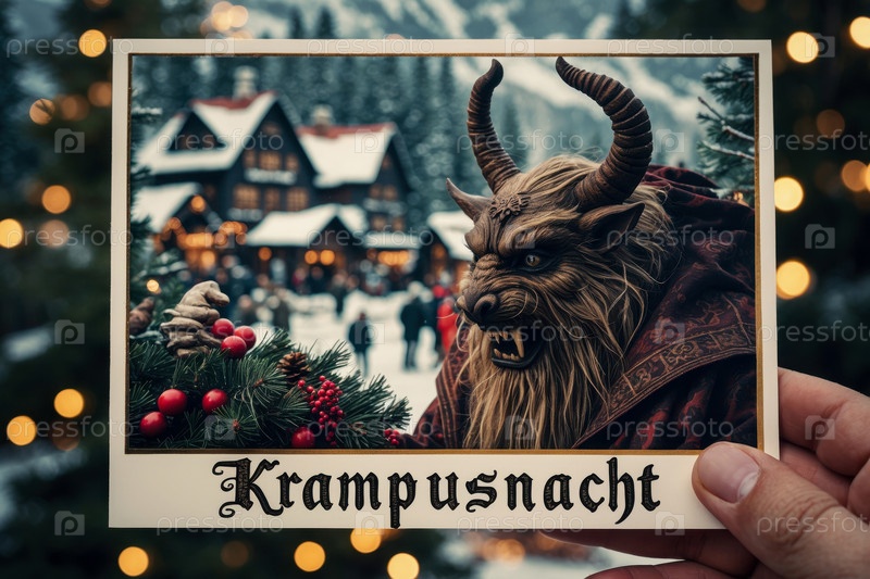 AI Generative Card Krampusnacht Ночь Святого Николая и жуткого монстра Крампуса Зимний праздник