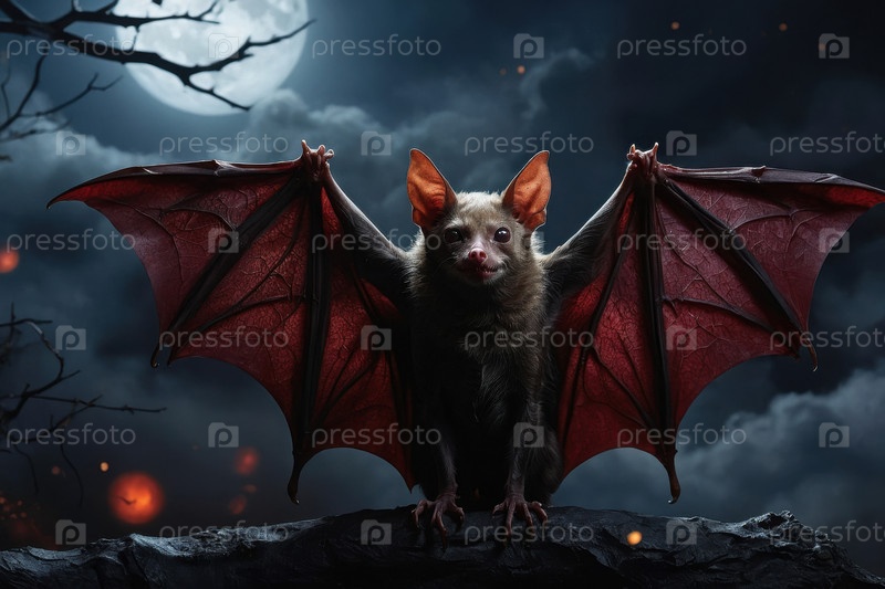 Черная летучая мышь распространяет крылья против темного, страшного Хэллоуина на фоне генеративного ИИ