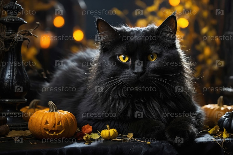 AI Generative Cute Fluffy cat в костюме ведьмы на темном пугающем тыквенном фоне