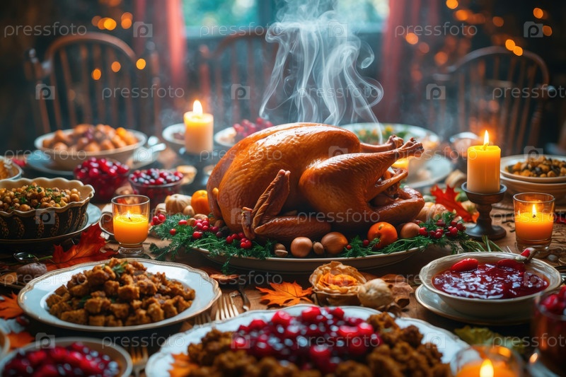 Жареный индей на украшенных столом желтых листьях и апельсиновых тыквах для ИИ Generative Thanksgiving