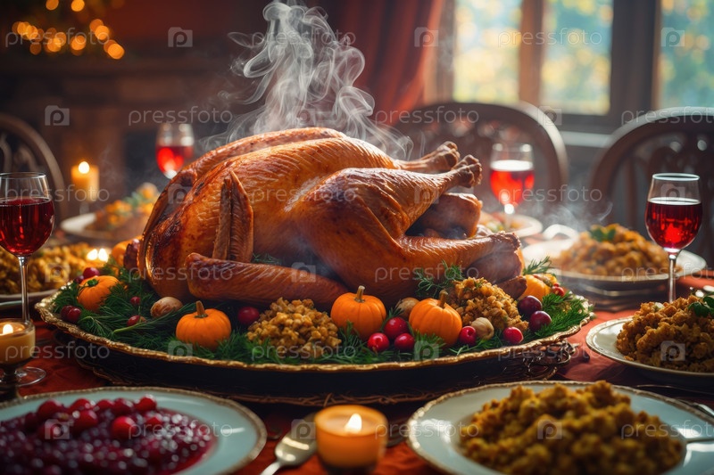 Жареный индей на украшенных столом желтых листьях и апельсиновых тыквах для ИИ Generative Thanksgiving