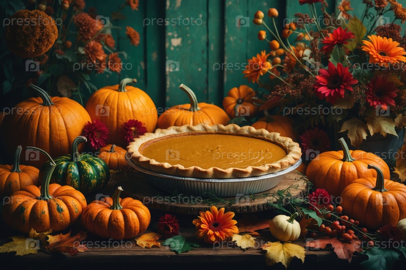 Дикий десерт из тыквенного пирога с корицей на украшенном столе с апельсиновыми тыквами в День благодарения