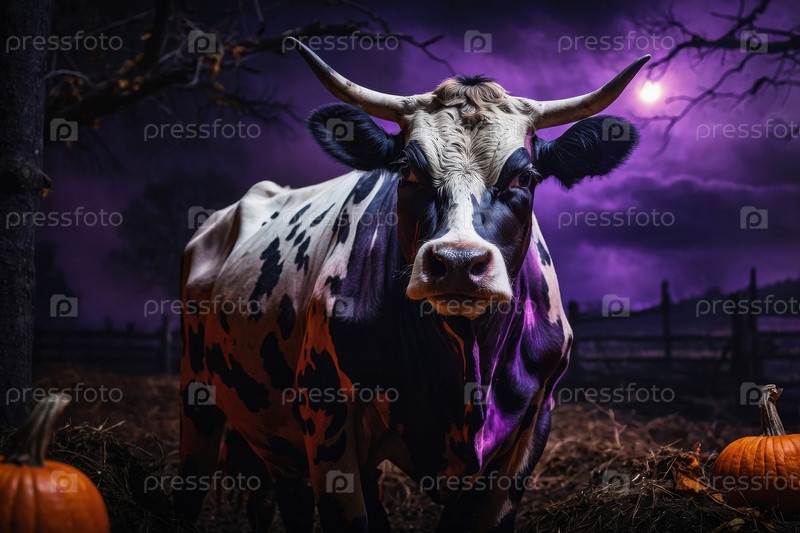 Рогатые коровы - животное фермы на темном страшном фоне Хэллоуина AI Generative pumpkin
