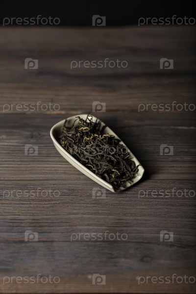 Изысканная художественная аранжировка листового чая, элегантно представленная в керамической посуде, размещенной на деревенском дереве