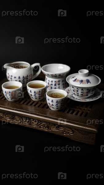 Традиционный китайский чайный комплект красиво отображается, с теплым чаем, который идеально подходит для безмятежных чайных церемоний