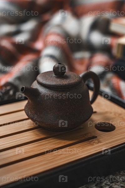 Элегантный чайник установлен на бамбуковой подносе, создавая уютную и привлекательную атмосферу