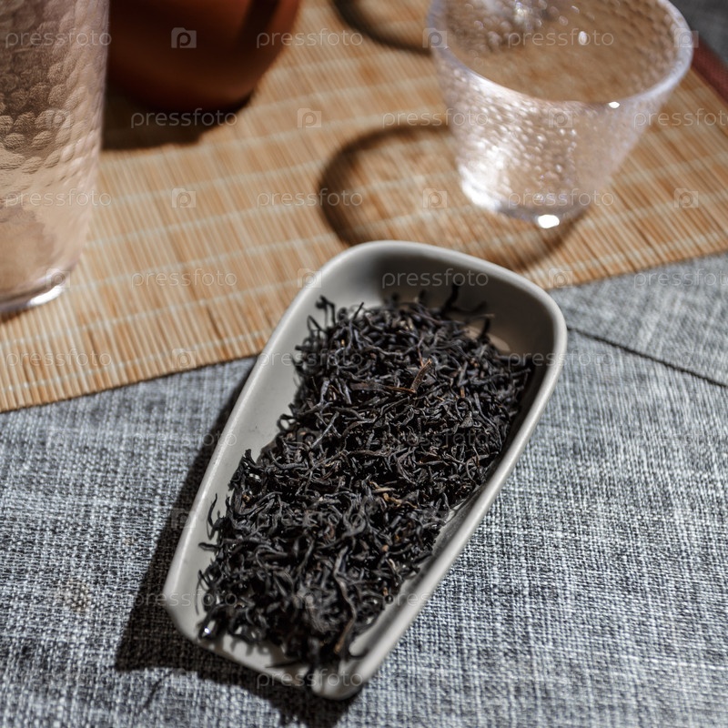 Бесплатные листья черного чая красиво отображаются на декоративной тарелке для вашего удовольствия