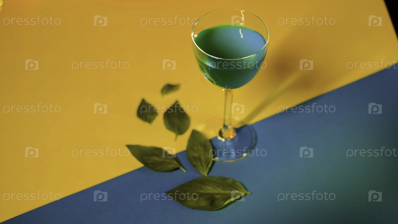 Синий алкогольный напиток стоит на декоративном красочном фоне с зелеными листьями, украшающими фон